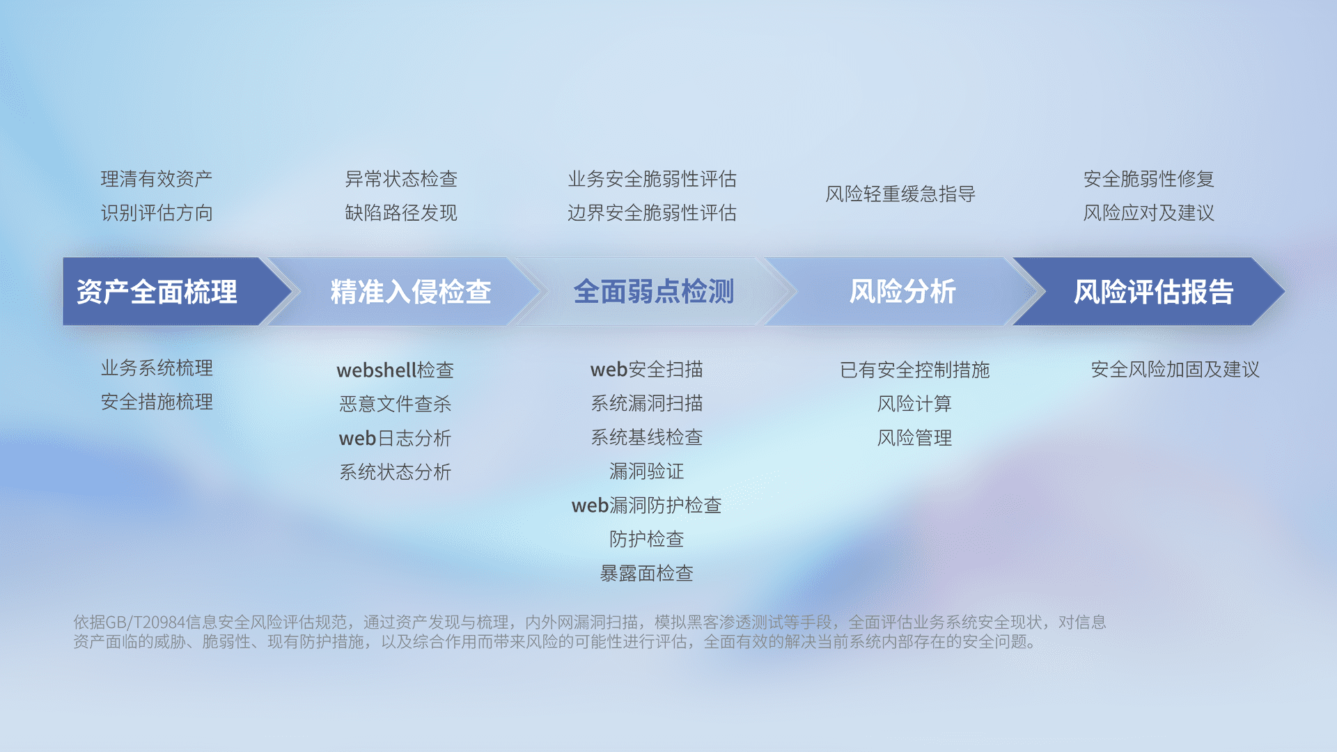 针对客户行业特性,,,,以专业的安全服务+多厂商联合解决方案提供专属的一站式安全管理服务,,,帮助客户全面感知网络空间威胁,,,基于识别、、检测、、、分析、、、、防护、、、、监测、、响应的服务理论模型,,,从方案咨询、、、、集成交付、、评估验证、、优化加固、、、、运维运营,,,,致力于为客户提供完整的闭环管理式安全服务。。。。以实战经验为客户打造高抵御风险的安全体系,,,帮助客户发现威胁、、、对抗威胁、、处置威胁,,,,不断积累安全对抗能力,,持续保障数字化安全。。。